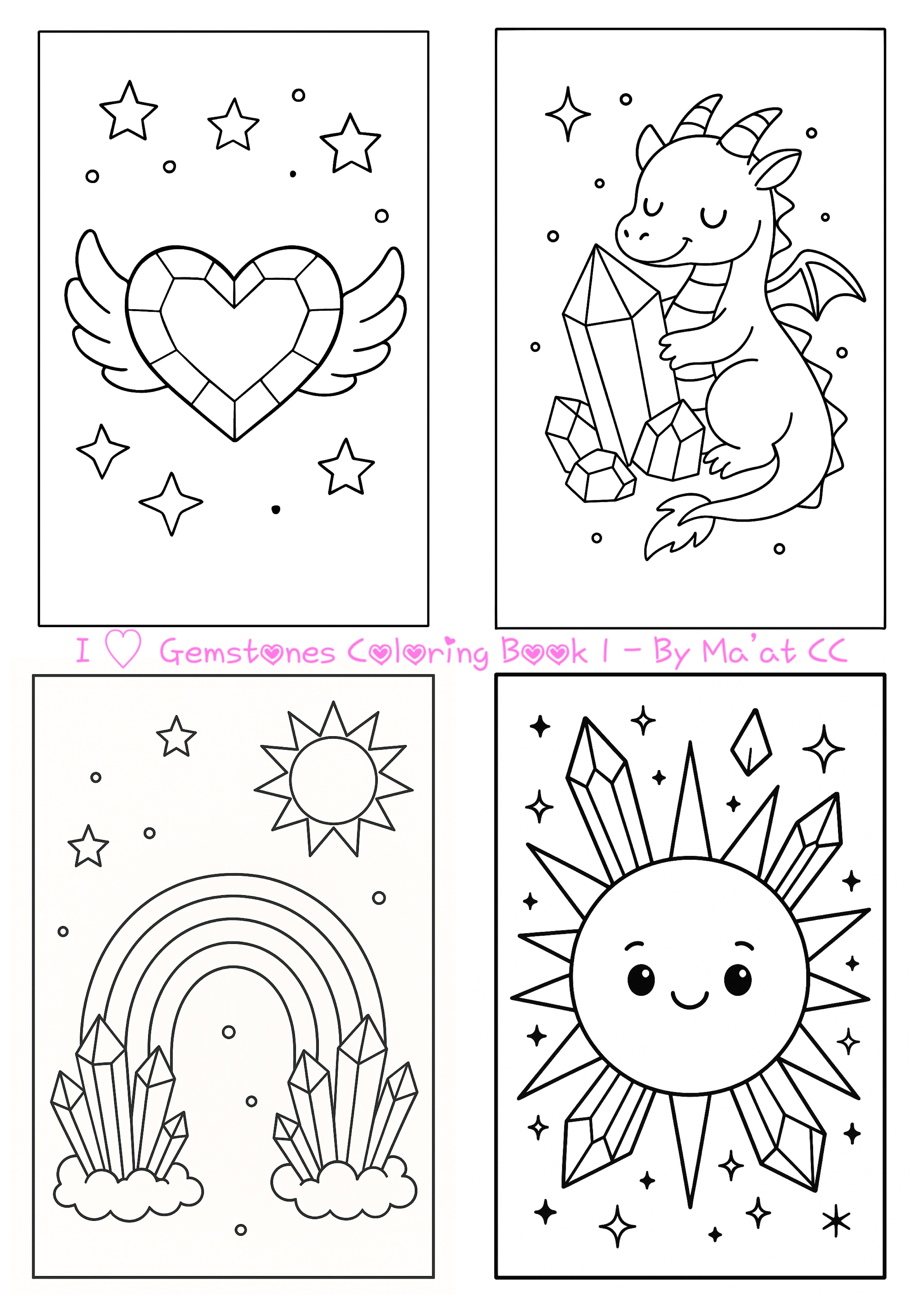 I Love Gemstones Coloring Book 1 is a Crystal Gemstone Coloring Book with Some Simple Rock inages, featuring a Crsyatal Gemstone Rainbow, Unicorn with Crystals, Dragon with Crystals, Crystal Mountain, Crystals with Flowers, Sun and Moon Crystals & More!