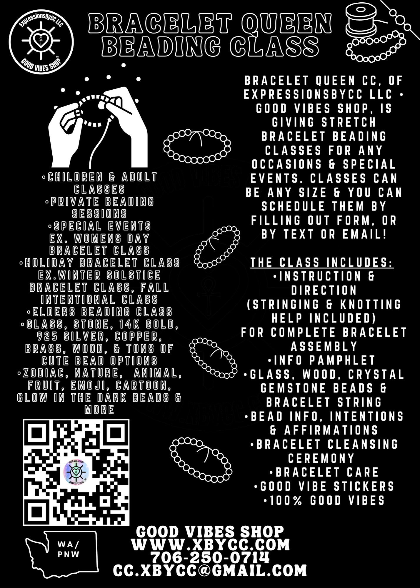 The ExpressionsByCC/XBYCC Good Vibes Shop Gemstone Beading Class for (2-6 Participants)! This Class includes All Materials, Your Choice of Location & The Good Vibes Shop Lifetime Warranty! ♡ There are 60+ Gemstone Bead Options, along with other cute glass and non-toxic beads to help create the perfect custom accessory!